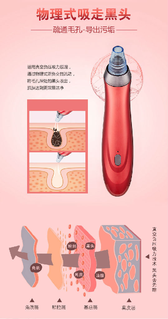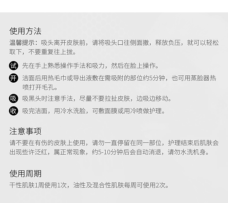 重要:有客户反馈黑头仪吸不出黑头,详细了解后,实际为使用方法不正确导致,因此购买采购前请详细阅读吸黑头仪使用说明,吸黑头仪使用前一定要先蒸脸或者热敷脸部,或者配合吸黑头导出液使用,先打开毛孔,打开毛孔,打开毛孔,(重要的事情说三遍),再使用吸黑头仪,这样一般效果都比较明显,