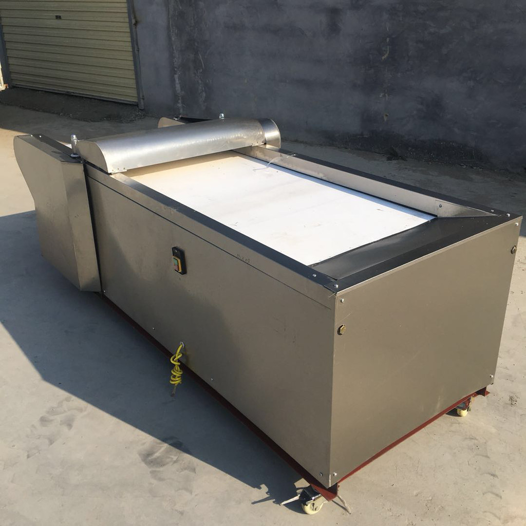 先转动可调偏心轮,使刀架行至下死点后,再使刀架向上抬起1/2毫米,使竖刀与输送带接触后,紧固螺母把竖刀紧固在刀架上。说明:刀架抬起高度可根据所切蔬菜自行掌握。如果高架抬起高度小,蔬菜有可能连刀,如果高架抬起高度过大,有可能切坏输送带。