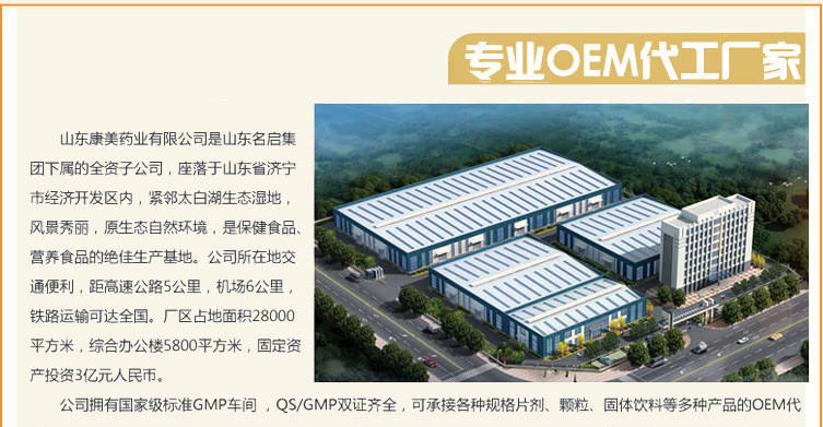 山东康美药业专注于保健养生事业的发展,目前主要从事植物萃取、营养食品、保健食品、特膳食品、医疗器械、卫消制剂、中药饮片的科研、生产、销售。公司生产研发设施设备完善,现拥有GMP标准厂房7000平方,厂区拥有保健食品生产线、特膳食品生产线、萃取生产线、口服液生产线、果冻生产线、易拉罐生产线、医疗器械生产线、卫消制品生产线。公司研制开发了名启、优多维、健康1+1、康美膳食等十个品牌600多种产品,产品渠道涉及电商、微商、孕婴连锁机构、美容养生机构等线上线下渠道,现已成为国内较为知名的健康产品生产基地。二期生产线巨资引进了三合一灌装机、全自动洗瓶机、口服液全自动灌装机、全自动灯检机、管道杀菌设备、全自动包装机等先进设备,公司新建降温清洗通道、烘干房等高标准车间,实现了10ml-20ml口服液、30ml-150ml功效饮料和235ml-330ml罐装功能性饮料的生产。