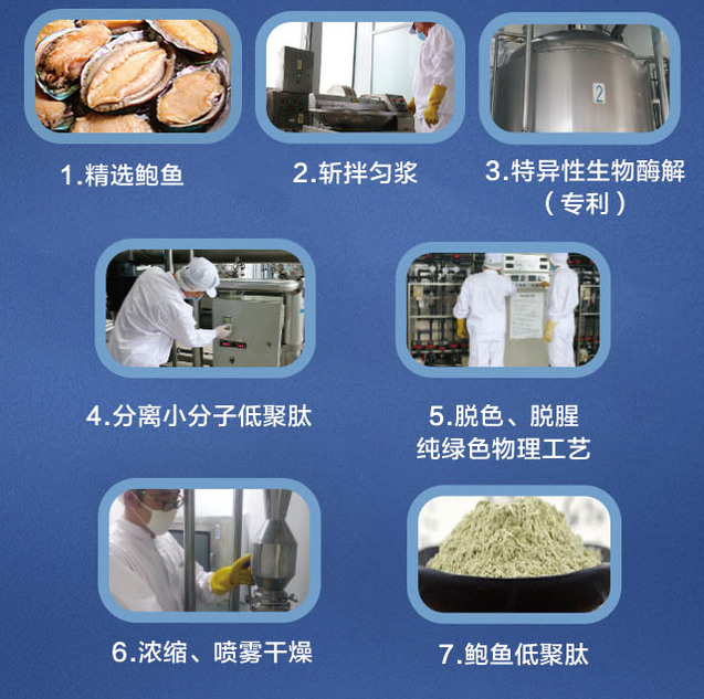 胶原是动物组织细胞外基质的一种结构蛋白,主要存在于动物的皮肤、骨、肌腱、韧带及结缔组织等部位中。胶原蛋白是胶原在酸、碱、酶或高温作用下变性后的产物。鳕鱼皮中的胶原蛋白含量占总蛋白含量的70%以上。鱼胶原蛋白肽是以鳕鱼皮为原料,经专用复合酶酶解后获得的一系列小分子肽,它们分子量小、易吸收,产品无苦味、腥味,为白色粉末状,可应用于保健品、食品、化妆品等领域。