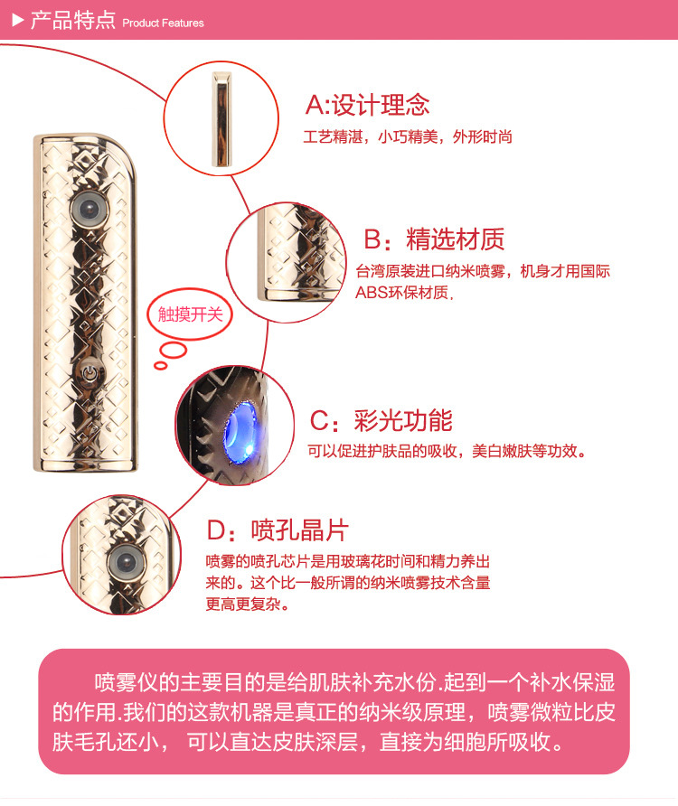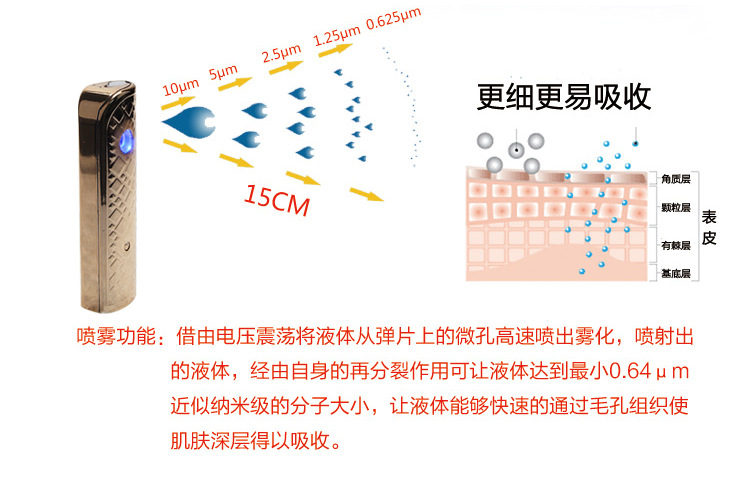1.纳米级喷雾,喷雾长度和时间增加,喷雾的水分更细腻,更加有效的蛇舞皮肤底层,达到深层补水的效果