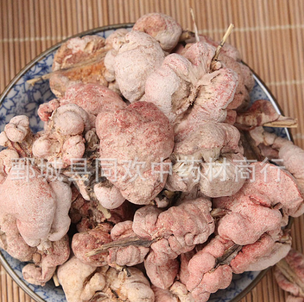 性状颜色:座瘤状,略呈椭圆形或纺锤形,长1-4cm,直径1-2cm。背部隆起,有不规则的横沟,基部凹陷,常有竹的残留枝竿。表面粉红色商品规格:统不规则个