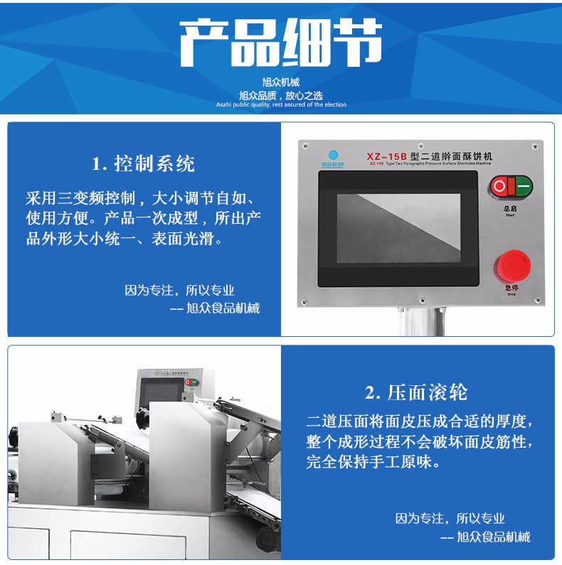 酥饼在我们的印象中只有叫酥饼的这一种产品,其实不是这样。可以用郑州市跟高新区来比喻,高新区是郑州市里面的一个区。酥饼**好像是郑州市一样。酥饼是一个大类,包含老婆饼、鸡仔饼、苏式月饼、厦门馅饼、鲜花饼、香酥饼、葱油饼、板栗酥饼、烧饼、驴肉火烧、肉夹馍等产品。旭众XZ-15B二道擀面酥饼机不仅仅是只能做酥饼,还能当做包子机、馒头机来使用。