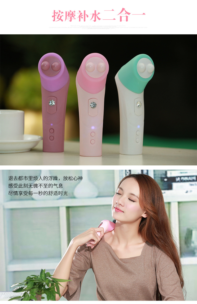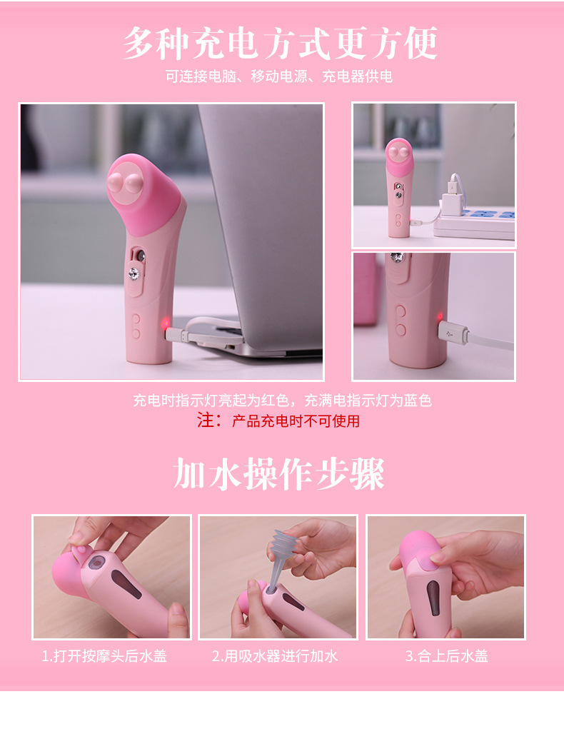 按摩补水仪,洁净青春容颜,按摩补水二合一,两档高频微振按摩,震动频率8500oom/分钟,高频震动按摩,收缩毛孔,提升活化细胞增强肌肤弹性,有销预防法令纹。 可加香薰 ,芳香助眠添加你喜欢的香精,散发出自然芳香有利于安神助眠.