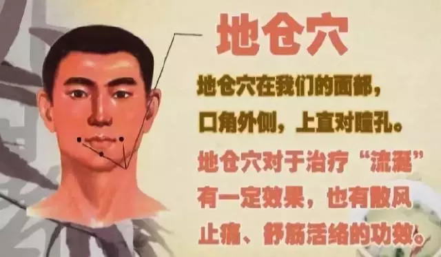 口腔非常重要,如果有吊线风(面瘫),会嘴歪眼斜,还有可能发展成偏瘫。按摩地仓穴、人中穴和承浆穴,可预防面神经瘫、音哑。