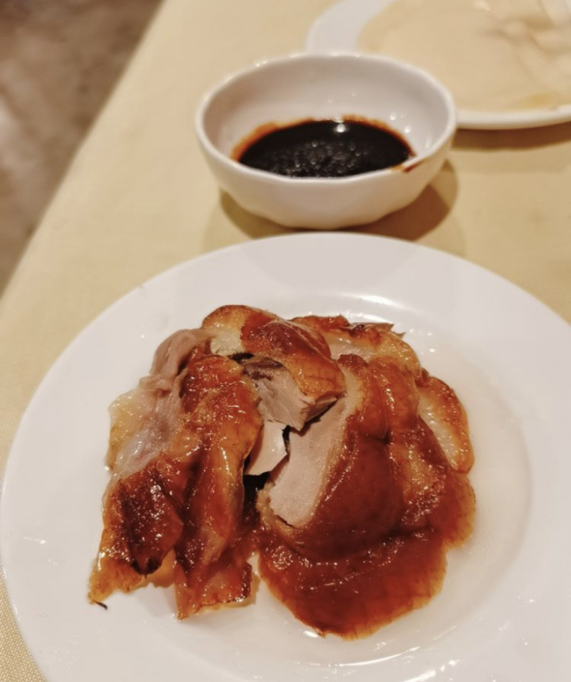 羊蝎子软糯耙嫩,十分入味,大块的羊蝎子啃起来也太爽了!北京烤鸭在店里是限量供应的,每天只有几只。烤鸭表皮酥脆,吃起来一点也不油腻。