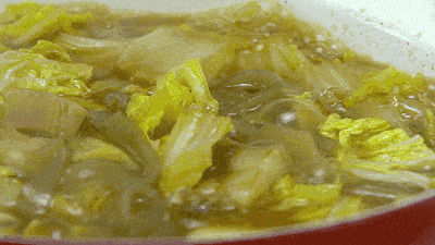 白菜炒软后加入1碗水,盖上锅盖焖至软烂。