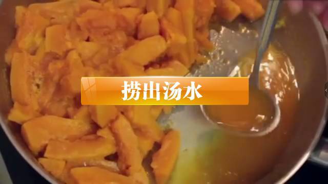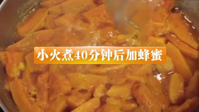 小火煮40分钟后加蜂蜜。再煮2分钟后,小心的把南瓜块堆到一旁。捞出汤水。