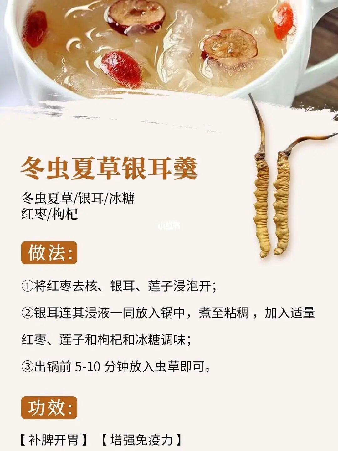冬虫夏草5枚,银耳1个,炖烂服,冬至日进补食用。适用于慢性支气管炎、哮喘、肺气肿、肺心病等呼吸系统疾病患者以及体弱多病者食用。