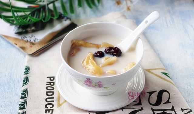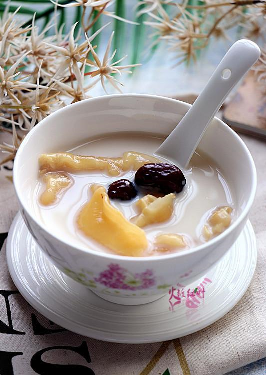 牛奶红枣炖鱼胶主材料:纯牛奶250克, 鱼胶3个,红枣3个, 姜片2克调味料:冰糖25克