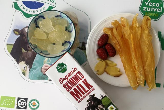 备各材料,最好能选用有机牛奶,鱼胶选肉较厚的