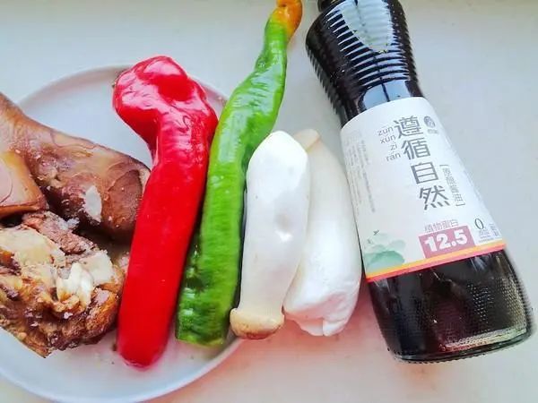 1.主料:杏鲍菇3个、卤猪耳朵一个、青红辣椒两个 辅料:植物油适量、盐适量、姜5克、生抽一大勺、鸡精1克