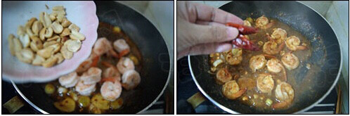 14.大火烧开宫保汁,倒入虾球。