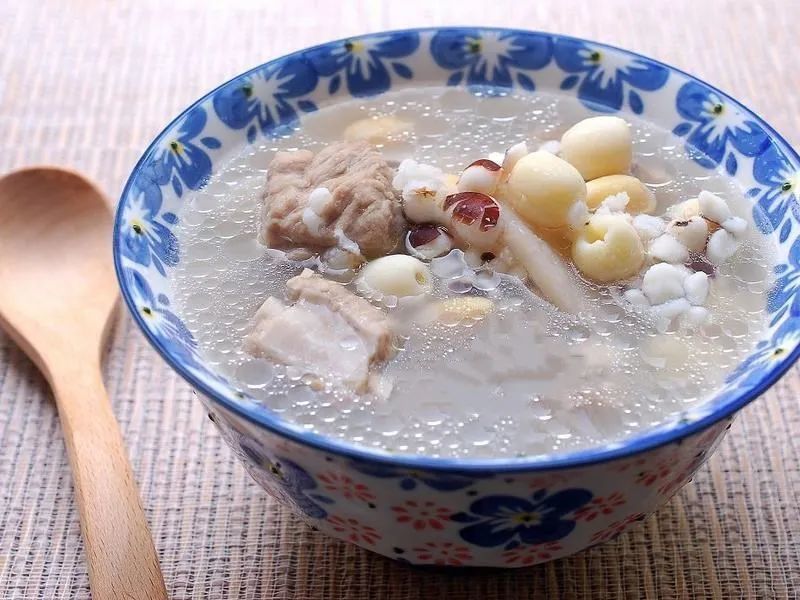 材料:茯苓15g、淮山药15g、芡实15g、莲子15g、猪脊骨500g、生姜3片、蜜枣2个。