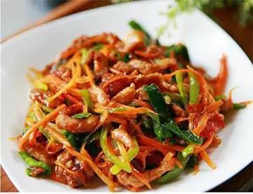 制法: 胡萝卜切丝,猪肉切丝后加盐、黄酒拌匀,陈皮浸泡至软切丝。先炒胡萝卜至成熟后出锅,再用油炒肉丝、陈皮3分钟,加入胡萝卜丝、少许盐、黄酒同炒至干,加水少量焖烧3~5分钟,撤入香葱即成。