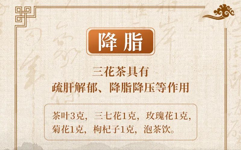 如想增强调脂效果,三七花可2克,其他量不变;想增强降压作用,菊花2克,其他量不变;想加强解郁效果,玫瑰花2克,其他量不变。茶叶可根据个人喜好,选择绿茶、红茶、花茶、普洱茶均可。