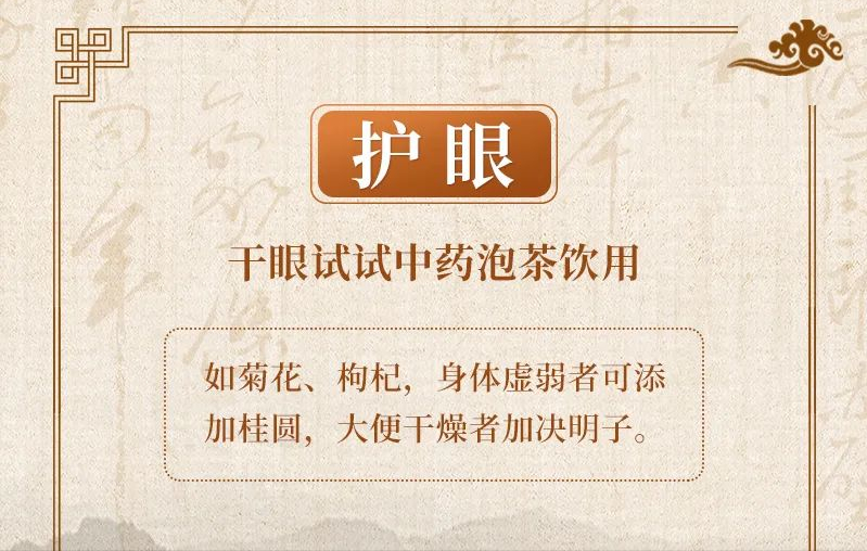 如果出现干眼,平时可用中药泡茶饮用,如菊花、枸杞,身体虚弱者可添加桂圆,大便干燥者加决明子。泡茶时可借助热气熏蒸双眼。