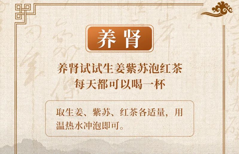 这是一款养肾食疗方,生姜紫苏泡红茶。取生姜、紫苏、红茶各适量,用温热水冲泡即可,每天都可以喝一杯。