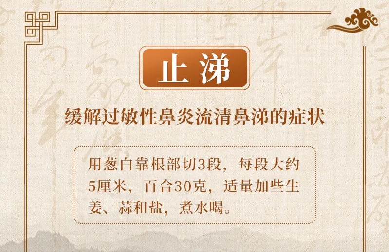 过敏性鼻炎典型症状是流清鼻涕、打喷嚏、鼻塞、鼻痒。缓解过敏性鼻炎流清鼻涕的症状,可以用葱白和百合。葱白靠根部切3段,每段大约5厘米,百合30克,适量加些生姜、蒜和盐,煮水喝。