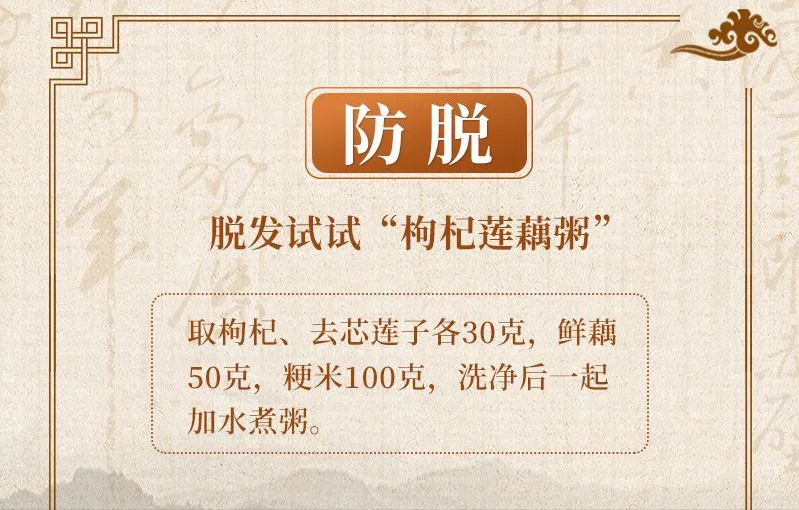 秋冬脱发可通过药膳调理,比如枸杞莲藕粥。取枸杞、去芯莲子各30克,鲜藕50克切成小块,粳米100克洗净,一起加水煮粥,加入适量砂糖即成。具有健脾止泻、养心安神的作用。