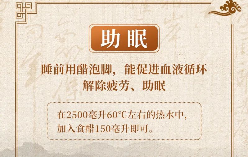 用醋泡脚能促进机体的血液循环,解除疲劳,帮助入睡。但需要注意不要用化学醋,建议每晚睡前将2500毫升60℃左右的热水倒入盆中,加食醋150毫升浸泡双脚,几天后可明显改善睡眠。