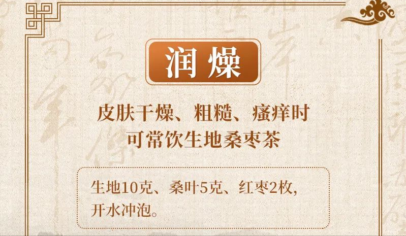 当皮肤干燥粗糙,伴鳞状脱屑、瘙痒炎症等时可服用滋阴、润燥、养肺中药,如西洋参、百合、玉竹、沙参、麦冬。也可常饮生地桑枣茶,生地10克、桑叶5克、红枣2枚,开水冲泡。