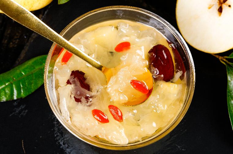银耳是最典型的养肺食物之一。现代医学研究证明,银耳主要的药理有效成分是多糖,银耳多糖是银耳最重要的组成成分,占其干重的60%~70%。同时,银耳多糖还是一种重要的生物活性物质,能够增强人体免疫功能,银耳多糖对人的肺和大肠还有很好的保健作用。雪梨甘甜多汁,不仅能清热解毒、生津润燥、宁心安神,还可帮助消化、促进食欲,并有良好的解热利尿作用。百合在养心安神、润肺止咳方面的功效也是无可替代的。