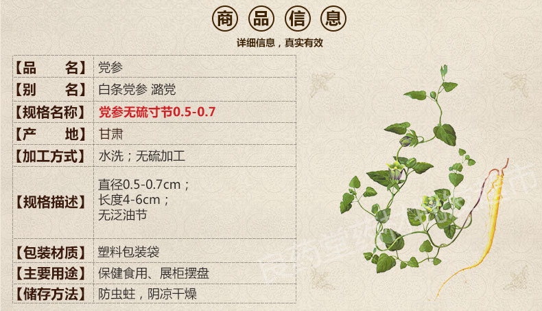 本网页所展示的有关【【满298元包邮】党参 甘肃寸节中条 产地 甘肃省 1袋500克_党参_良药堂药材批发超市】的信息/图片/参数等由医导网的会员【良药堂药材批发超市】提供,由医导网会员【良药堂药材批发超市】自行对信息/图片/参数等的真实性、准确性和合法性负责,本平台(本网站)仅提供展示服务,请谨慎交易,因交易而产生的法律关系及法律纠纷由您自行协商解决,本平台(本网站)对此不承担任何责任。您在本网页可以浏览【【满298元包邮】党参 甘肃寸节中条 产地 甘肃省 1袋500克_党参_良药堂药材批发超市】有关的信息/图片/价格等及提供【【满298元包邮】党参 甘肃寸节中条 产地 甘肃省 1袋500克_党参_良药堂药材批发超市】的商家公司简介、联系方式等信息。
