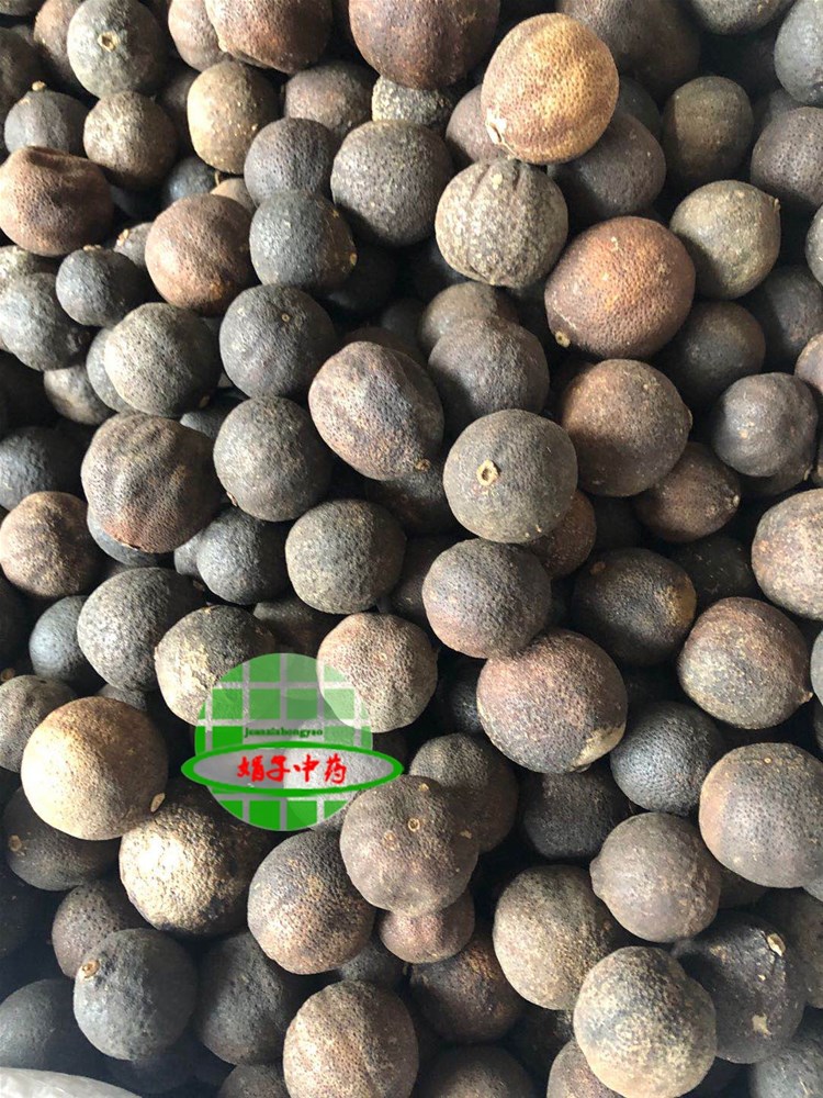 【性 状】:呈不规则的圆球形,部分被横剖为两瓣,直径0.3-2cm。外表面深灰色或黑绿色,有细皱纹及小瘤状突起,可见细密小凹点(油室),顶端有稍突起的花柱残基,基部有圆形的果柄痕。质坚硬,横剖面果皮黄白色或淡黄棕色,厚0.15-0.4cm,中央有瓤囊7-13瓣,干缩成片状,气清香,味苦辛。以个匀、质硬、体重、肉厚、瓤小、香气浓者为佳