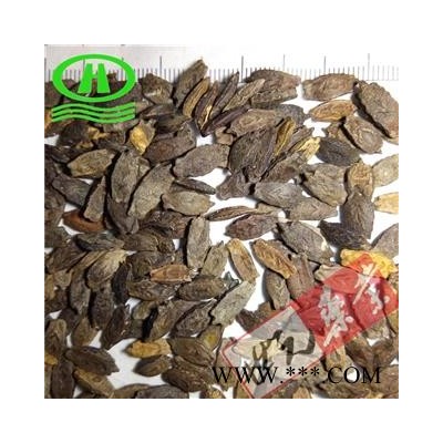 【性 状】本品略呈扁长方形,长1-1.5cm,宽4-7mm,厚2-3mm,表面棕褐色至黑褐色,具凸凹不平的雕纹呈类人字形、类圆形、不规则形沟纹及点状突起;一端有三角形突起
