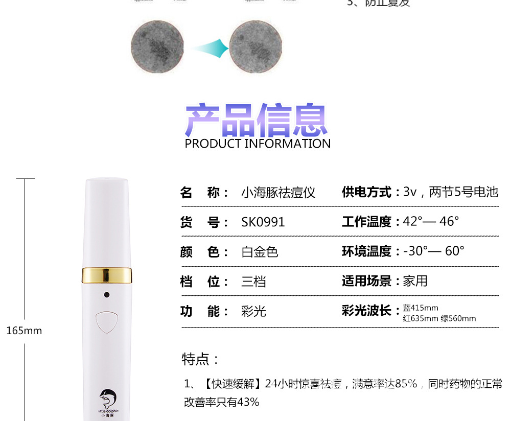 LED祛痘仪具有红蓝黄三种光疗与热疗的效果,对于防止青春痘爆发、去除青春痘、帮助修复治愈后的青春痘疤痕有良好疗效。LED祛痘仪采用的先进科研技术成果利用光疗蓝紫光和热疗对中度及轻度的青春痘(医学名座疮)已经被有关生物实验室证明具有**的有效率,和90%的治愈率。此波长红光对于治愈后的青春痘有预防产生痘印和帮助去除痘印有良好效果。此波长绿光对于抑制皮脂腺分泌,缩小皮肤毛孔具有良好效果,可以防止青春痘爆发和减少治愈后复发。 LED祛痘仪通过给不同的患者进行无数次测试表明,疗效显著,LED祛痘仪所采用的光疗和热疗属于物理疗法,安全并无任何副作用。目前在国内外均推嵩绿色天然疗法(即不含害化学成分,无药物残留,无毒副作用) |