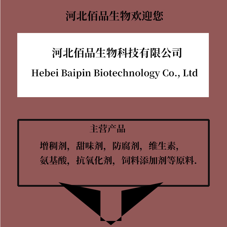 河北佰品生物科技有限公司经销批发的食品添加剂、增稠剂、甜味剂、酸味剂、乳化剂、抗氧化剂、营养强化剂、防腐保鲜剂畅销消费者市场,在消费者当中享有较高的地位,公司与多家零售商和代理商建立了长期稳定的合作关系。河北佰品生物科技有限公司经销的食品添加剂、增稠剂、甜味剂、酸味剂、乳化剂、抗氧化剂、营养强化剂、防腐保鲜剂品种齐全、价格合理。河北佰品生物科技有限公司实力雄厚,重信用、守合同、保证产品质量,以多品种经营特色和薄利多销的原则,赢得了广大客户的信任。
