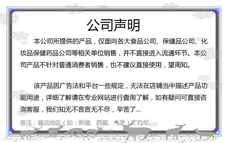 我厂生产提取物原料,采用高质量原材料进行生产。每个生产流程都严格把控,再确保每样产品都是合格后,方可出厂销售!客户的满意**是我们一贯的追求!