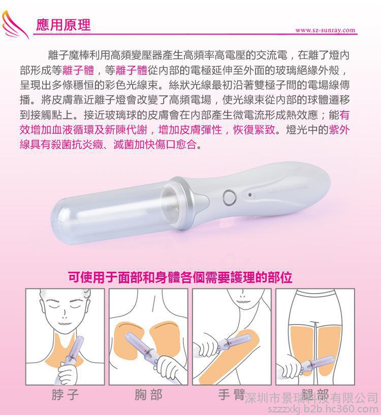 離子魔棒利用高頻變壓器產生高頻率高電壓的交流電,在離了燈內部形成等離子體,等離子體從內部的電極延伸至外面的玻璃絕緣外殼,呈現出多條穩恒的彩色光線束。絲狀光線**初沿著雙極子間的電場線傳播。將皮膚靠近離子燈會改變了高頻電場,使光線束從內部的球體遷移到接觸點上。接近玻璃球的皮膚會在內部產生微電流形成熱效應;能有效增加血液循環及新陳代謝,增加皮膚彈性,恢復緊致。燈光中的紫外線具有殺菌抗炎癥、滅菌加快傷口愈合。