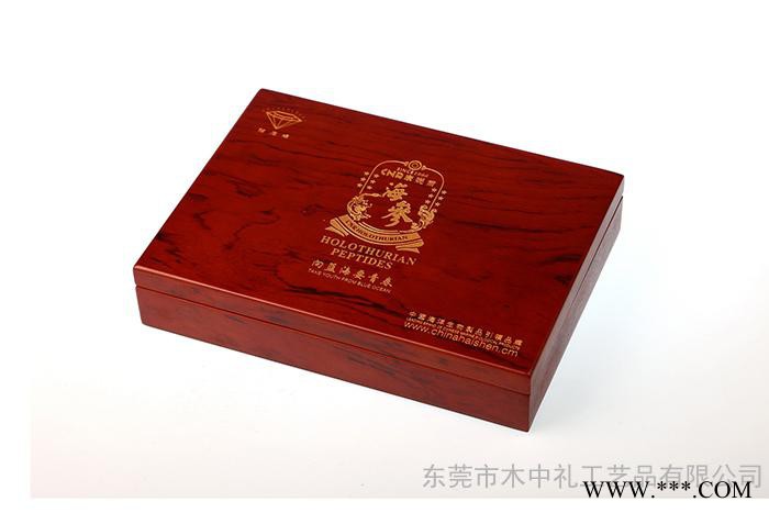 此款海参木盒为进口MDF板贴红木皮制作,喷仿红木色,盖面激光雕刻上金色,设计简单不失档次,稳重大方,喷漆全采用无毒无味的保护漆,此款木盒是海参物品**包装。海参木制包装盒定制**