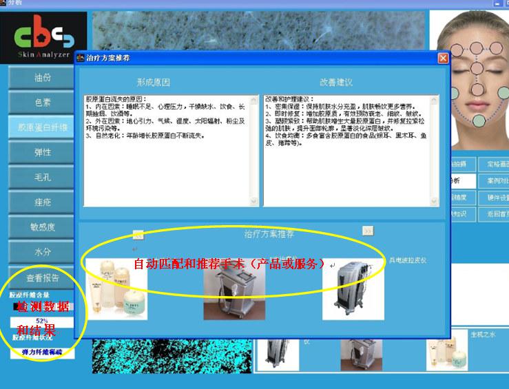 1、通过拍摄一张面部肌肤图片,瞬间分析出病人皮肤的数据,例如:检测弹性,系统分析完成之后,会弹出“皮肤弹性45%”,并得出结论“皮肤弹性较差”。