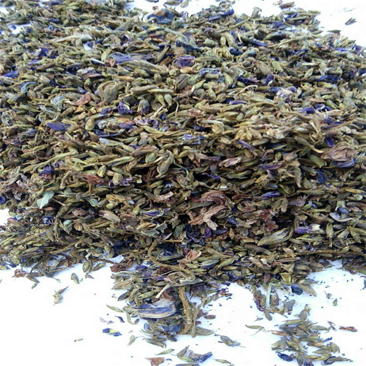 葛花呈不规则的扁长圆形或略成扁肾形,长5~15mm,宽2~6mm,厚2~3mm。萼片灰绿色,基部连合,先端5齿裂,裂片披针形,其中2齿合生,表面密被黄白色毛茸。基部有两片批针钻形的小苞片。花瓣5片等长,突出于萼外或被花萼包被,蓝紫色,外部颜色较浅,呈淡紫色。气微弱,味淡