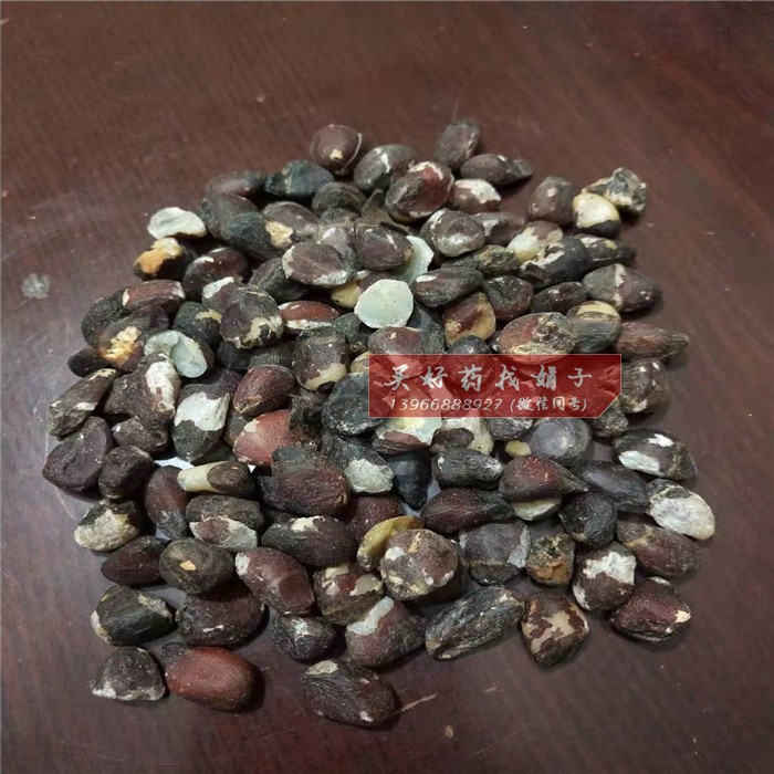 【形 状】:种子略呈四面体,一面隆起,三面稍平坦;长1~2cm,宽0.5~1cm。表面灰黄白色至灰棕色,有多数隆起的纵脉纹,种脐位于种子的一端。种皮硬而脆,易碎。种仁不规则长卵形,外被暗紫褐色薄膜,具微细皱纹;胚乳黑棕色,子叶心脏形稍尖,色较浅。