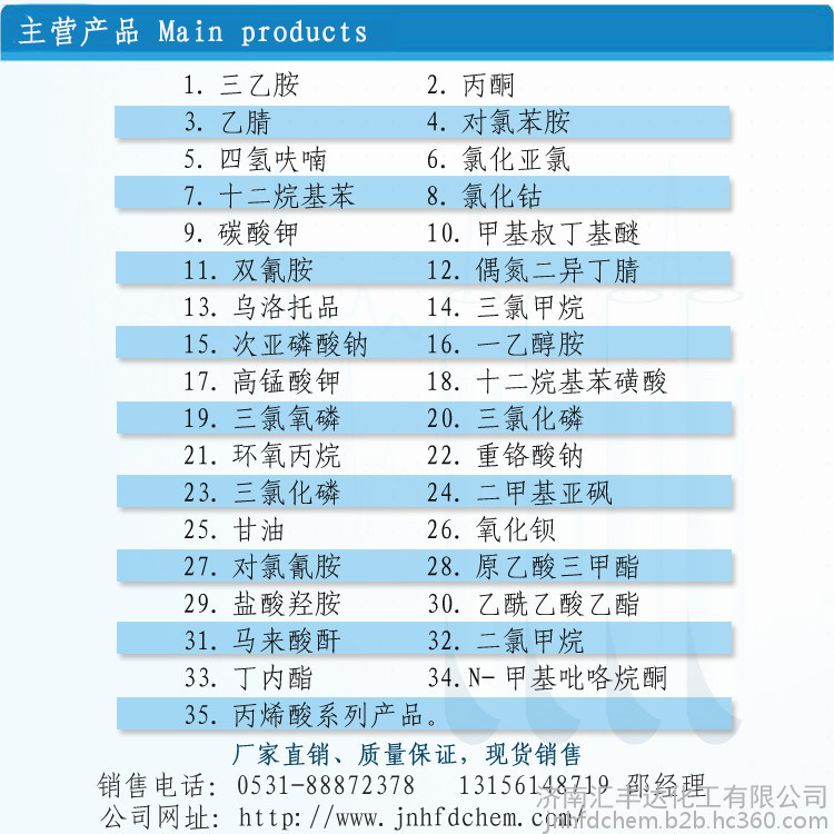 济南汇丰达化工有限公司坐落于中国山东省省会——济南市。成立于2006年,是一家主要从事化工综合性贸易公司,公司前身于2003年一直从事进出口贸易,经过13年发展,公司先后与国内多家大型化工厂合作,集国内国际贸易、运输服务于一体。 本公司一贯坚持“以信誉为生命,以质量为根本,以服务为保证”的经营方针,连续多年被评为“重合同,守信誉”单位,经相关单位授予危险品经营许可,拥有标准的危险品仓库及罐区并配套专业的危险品运输车辆,本公司立足于华北地区,业务范围遍布全国。