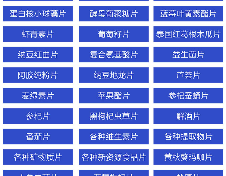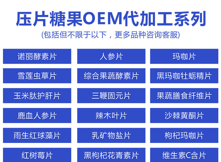 生产、加工/OEM、销售:代餐(小胖瓶营养代餐、五谷代餐袋装、条装)胶原蛋白(果冻条、玻璃瓶胶原饮、异型袋胶原饮)、枸杞原料(异型袋、条形)酵素果冻(条形、杯状)、酵素果粉(条型、小胖瓶)、即食燕窝(金碗装、玻璃瓶、冻干即食燕窝)、即食花胶(金碗装、玻璃瓶装)、冻干产品(即食燕窝、即食银耳燕窝枸杞红枣)等各种大健康食品、饮料、固体饮料、果冻、食疗性固体饮料/燕窝/咖啡